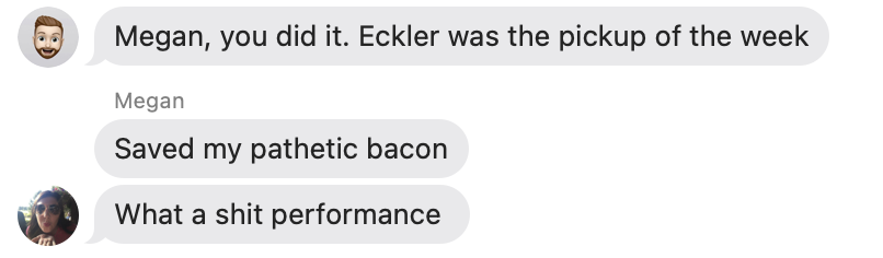 This week’s honors to go JBeeZyn. After two narrow misses, JB gets his first W in dramatic fashion. Despite Mahomes (still) having a lackluster start to the season, the Zyns were propped up by a monster performance from Kyren Williams and a sneaky pickup of Keon Coleman.